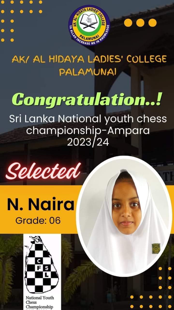 Congratulations to Nehmathullah Naira of Grade 6, Palamuna Al Hitaya Women's College, who won the Sri Lanka National Youth Chess Championship - 2023/24, Amparai District "Chess" tournament and was selected for the national level.