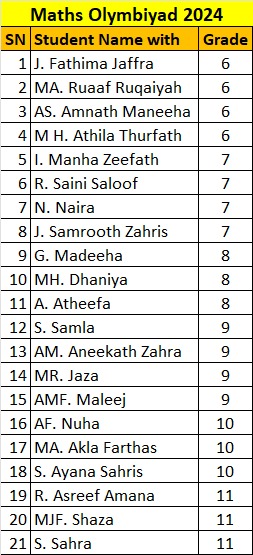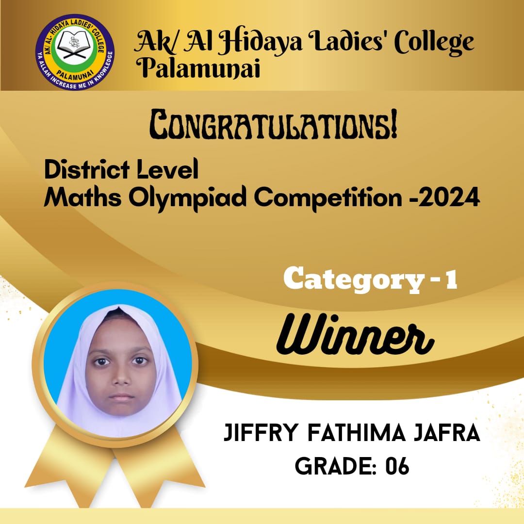 The school community congratulates and appreciates our school student Jiffry Fathima Jafra, a student of grade 6, who competed in the district level mathematics Olympiad competition and was selected for the provincial level, the teachers who taught her and the principal B. Muhajireen Sir who guided her.