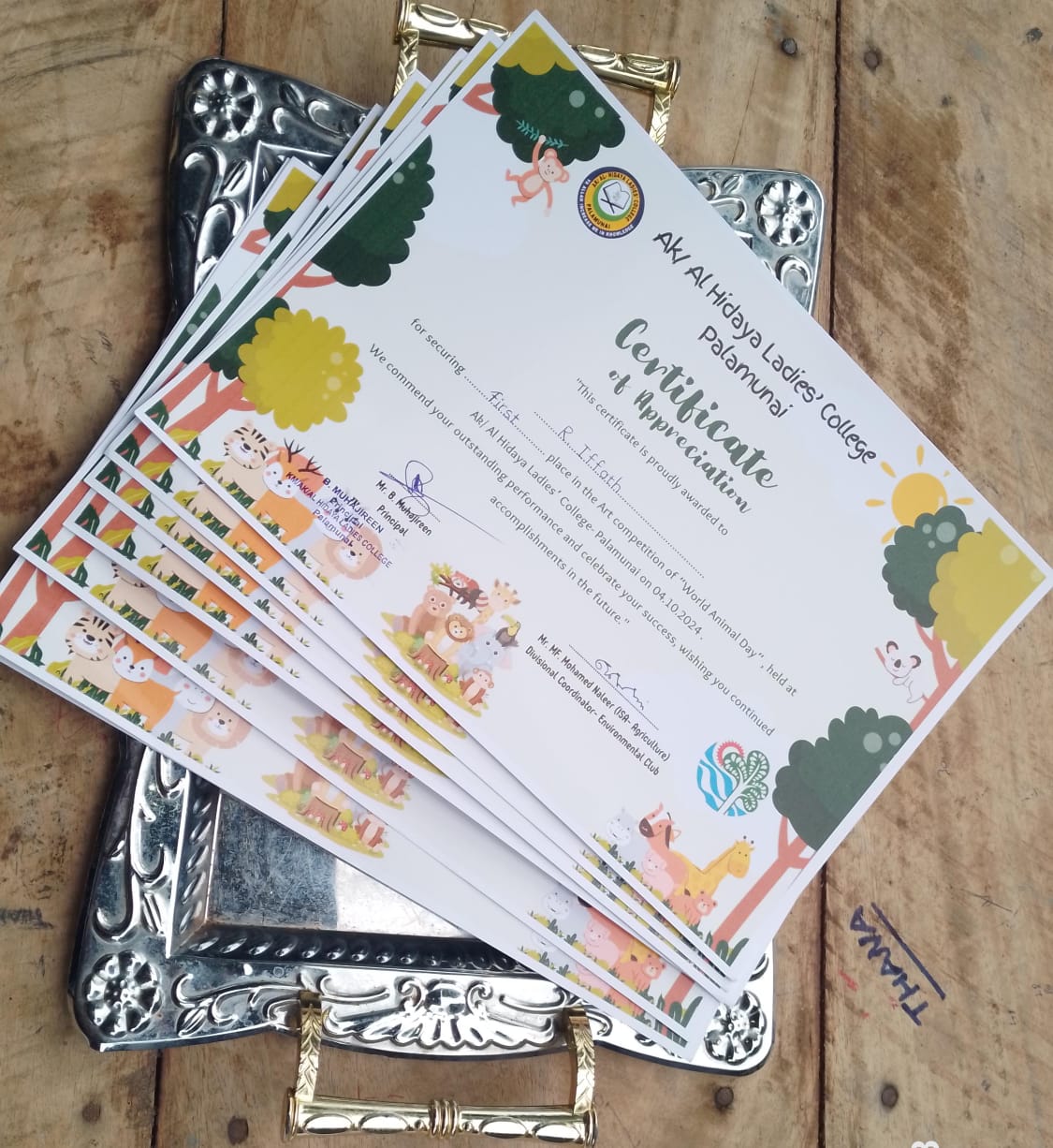 Also, for the World Animal Day celebrated on 2024.10.04, certificates were given to the students who won the drawing competition organized by our school between Palamunai schools.
